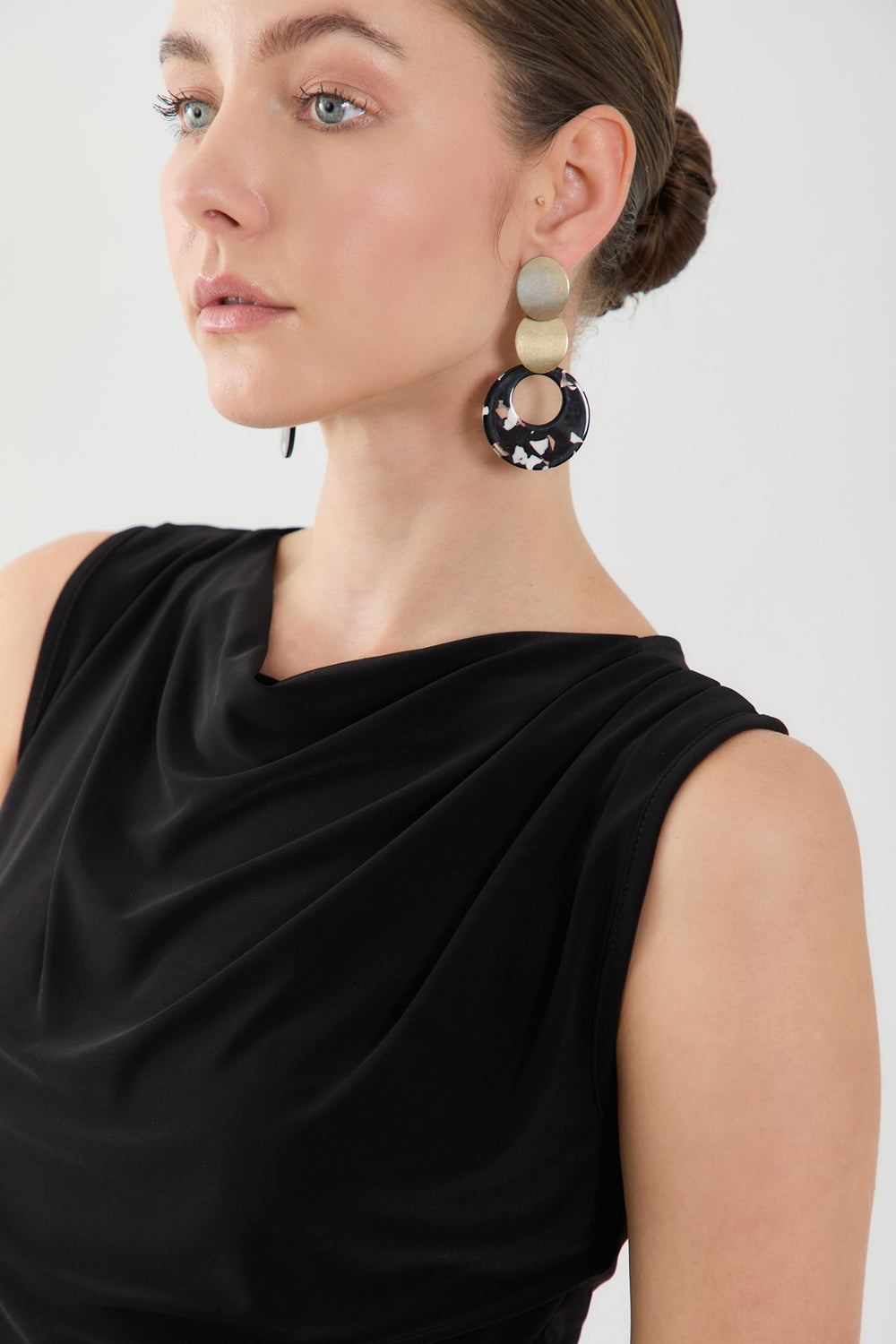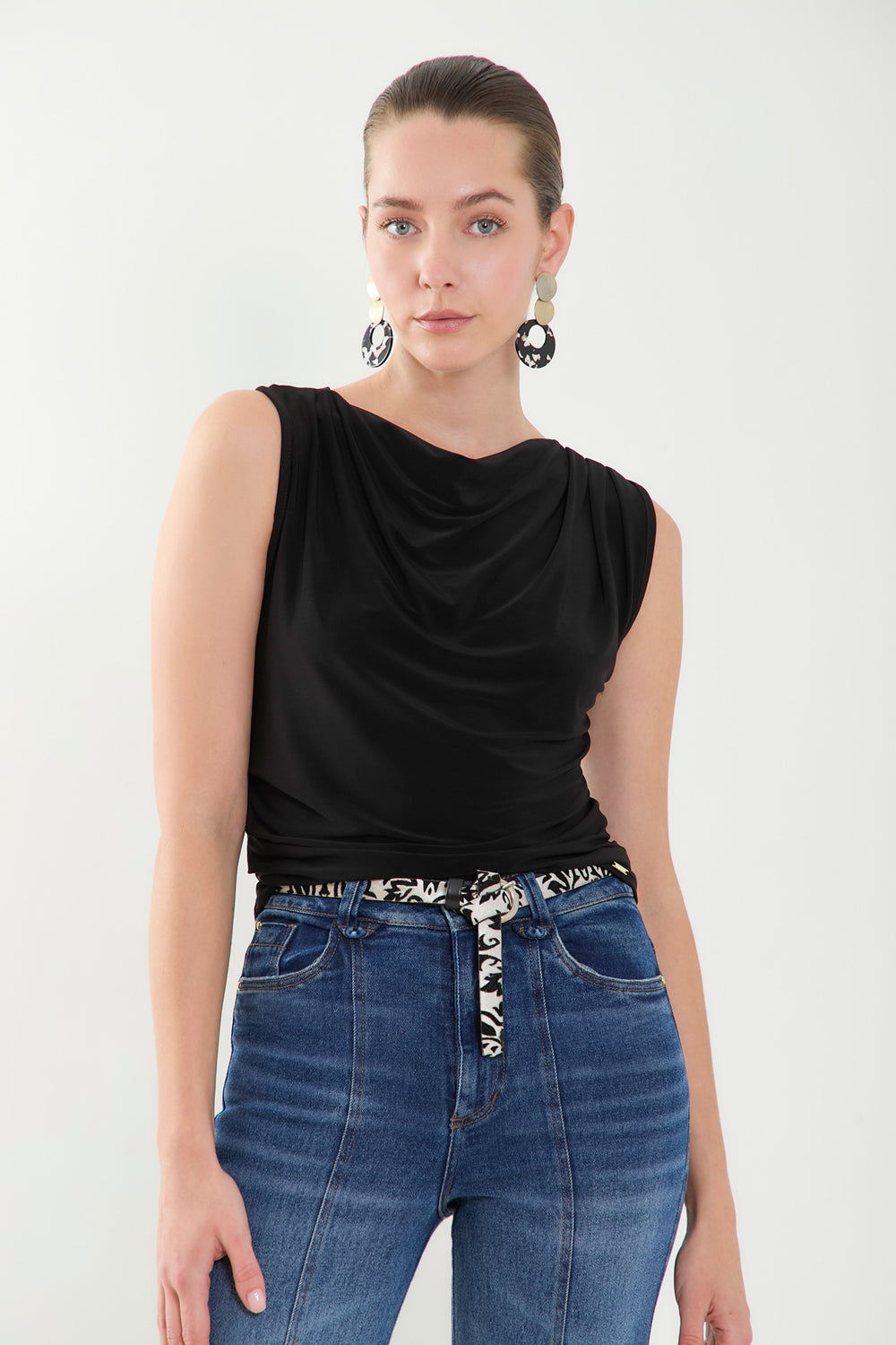 Sofisticación y estilo se unen en esta blusa sin mangas de diseño asimétrico. Con un delicado drapeado en el escote y caída fluida, esta prenda en tono caramelo y negro realza la silueta con elegancia. Perfecta para eventos formales o para elevar tus looks de oficina con un toque moderno y femenino. Su tela ligera y suave se adapta cómodamente al cuerpo, brindando frescura y distinción en cada uso.