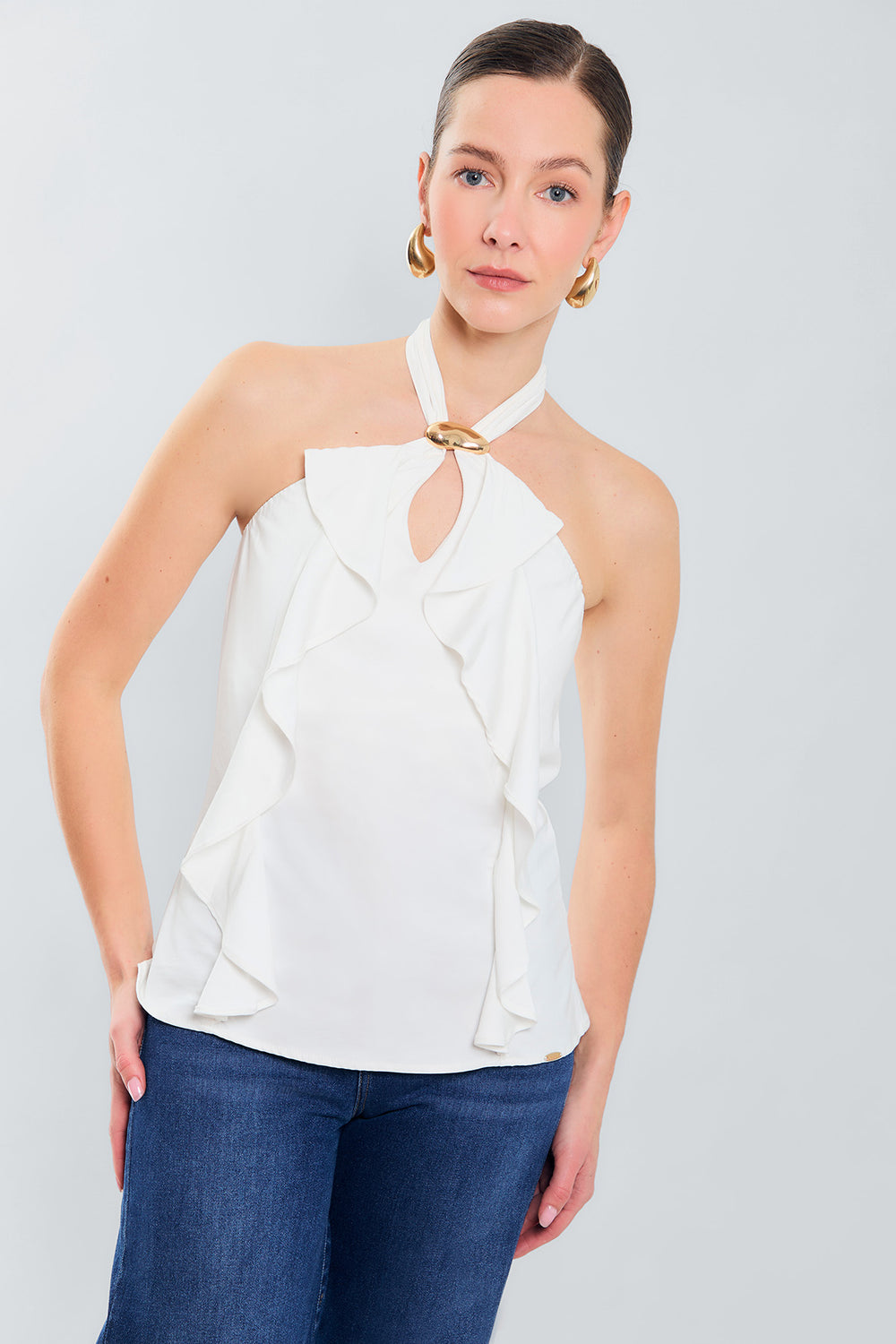 Blusa halter en tonos delicados olanes y elegante detalle dorado al cuello, femenina y sofisticada para brillar en cualquier ocasión.