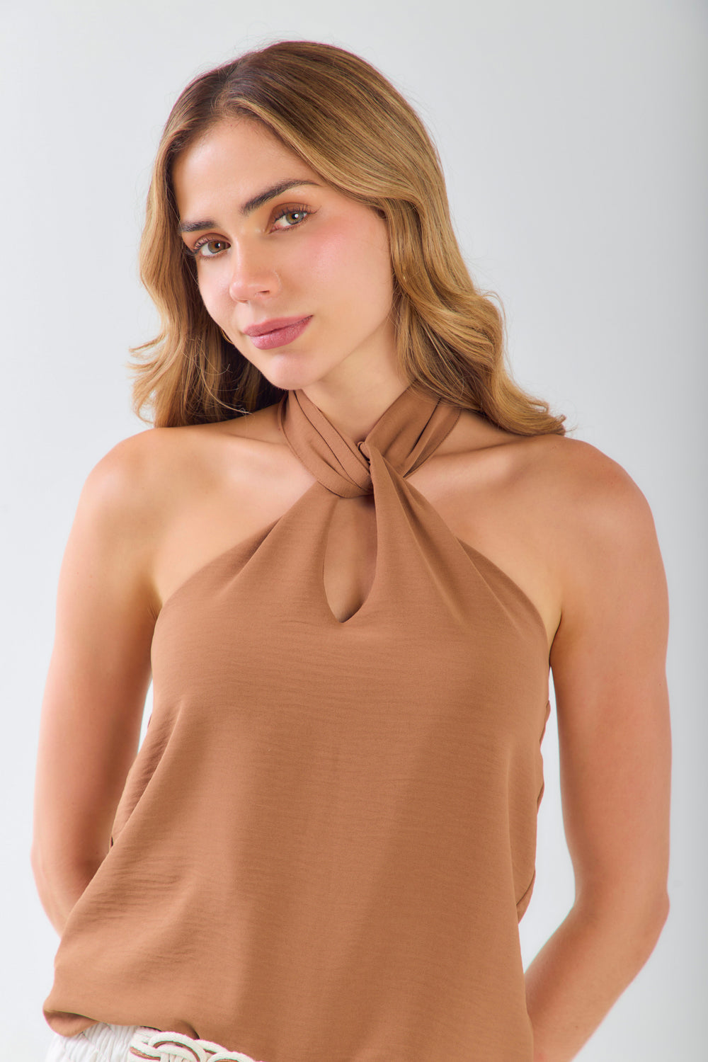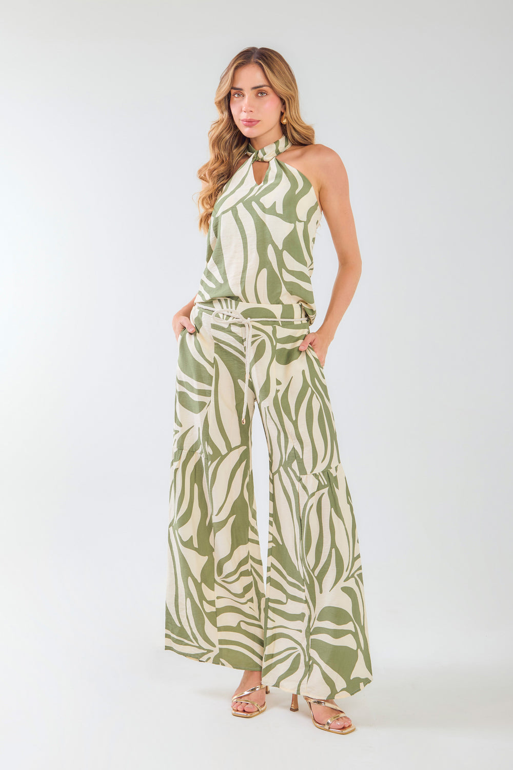 Fresca y sofisticada. Esta blusa tipo halter con estampado tropical es ideal para días soleados. Cuenta con cuello alto ajustable con lazo, silueta suelta y caída fluida que aporta comodidad y estilo.