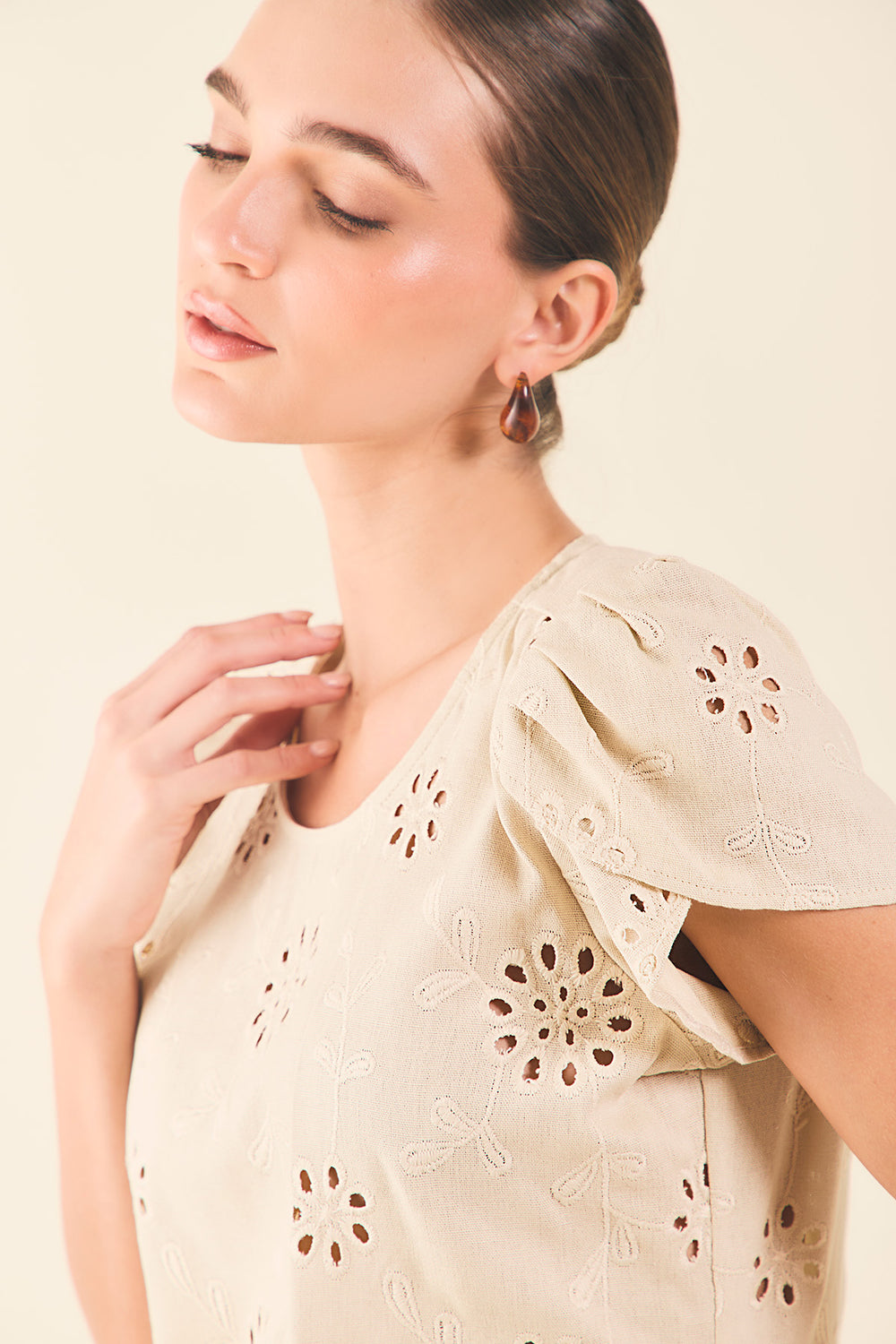 Blusa ligera en tono suave con delicados detalles calados que aportan frescura y feminidad. Ideal para un look romántico y cómodo en cualquier ocasión.