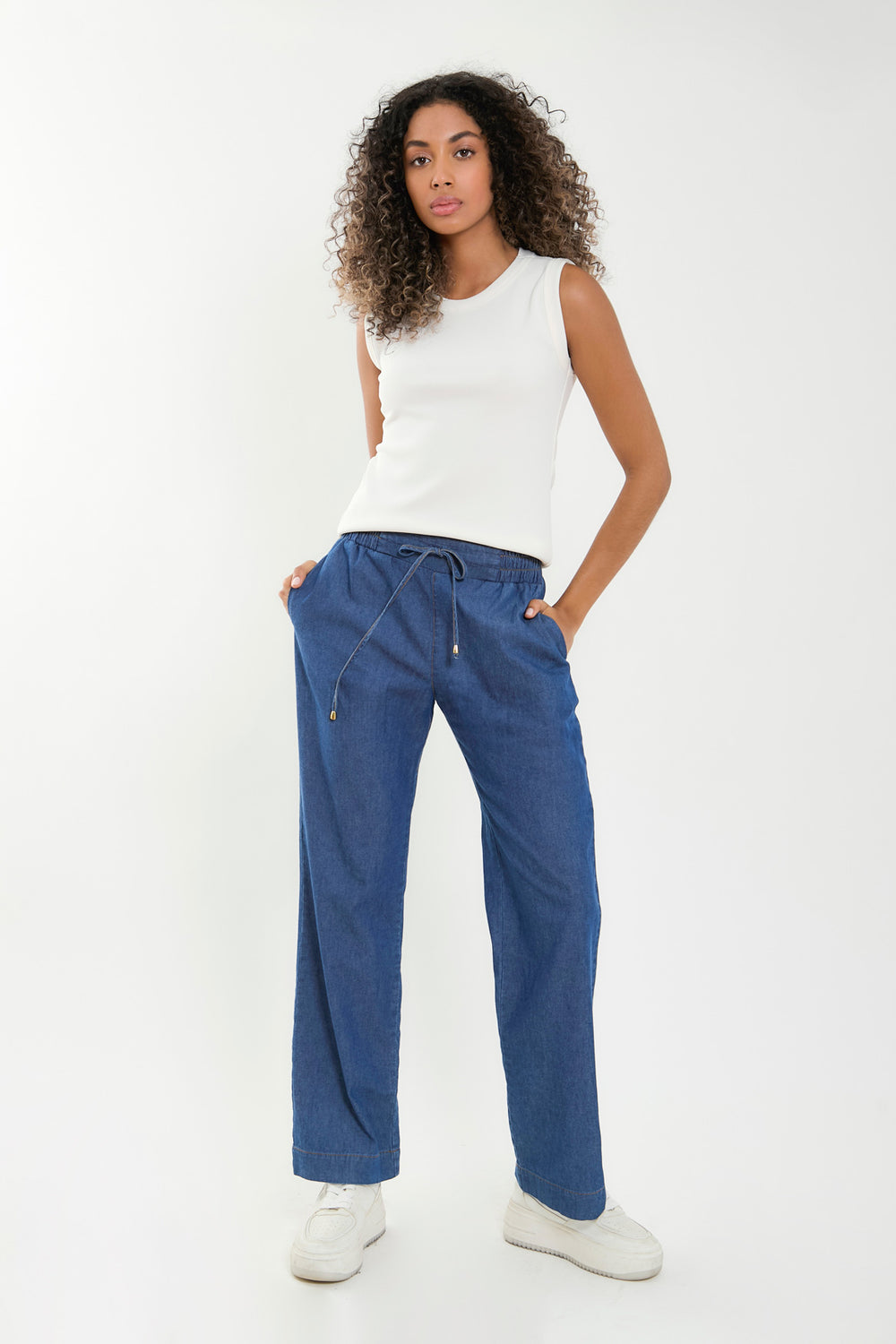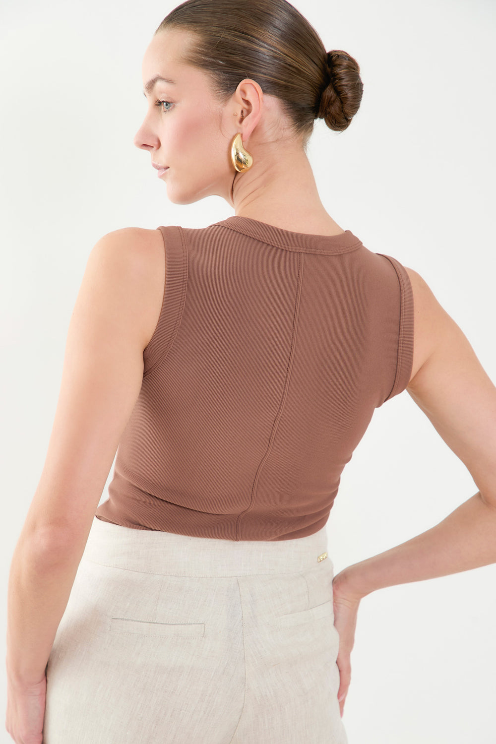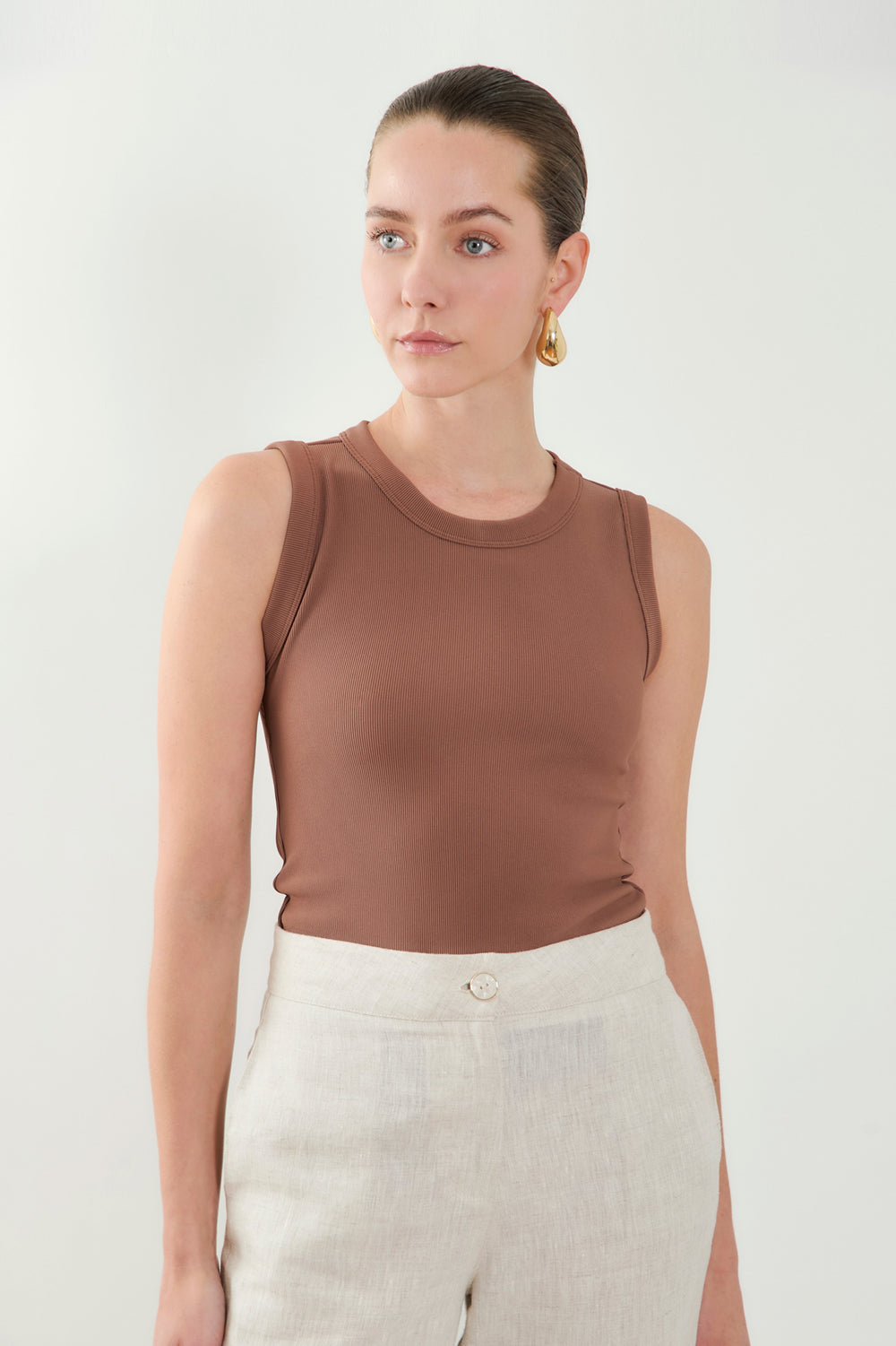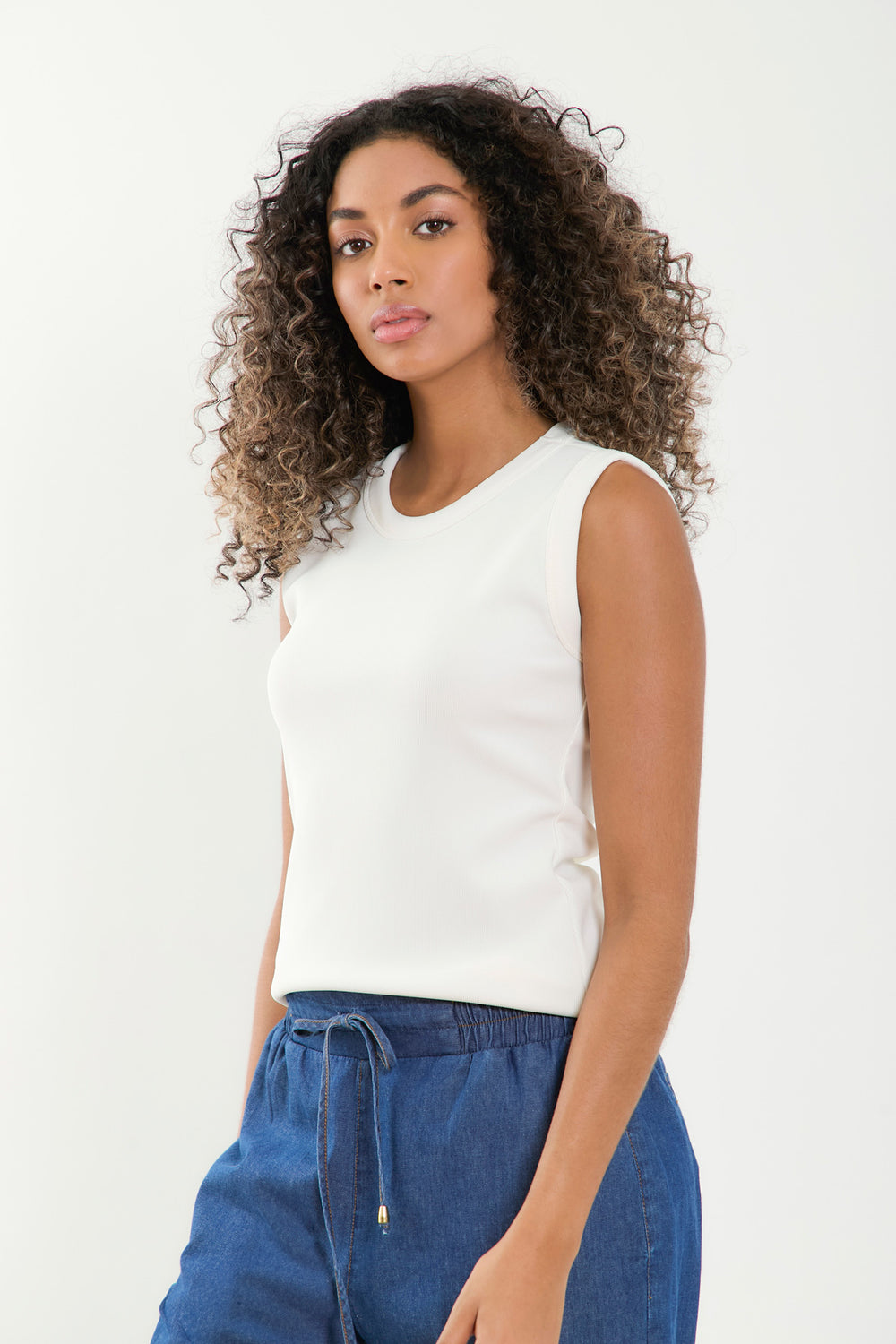 Versatilidad y estilo en una sola pieza camiseta sin mangas confeccionada en tela rib con mezcla de poliéster y spandex, que se ajusta cómodamente al cuerpo gracias a su silueta Slim fit.Su textura le aporta un toque moderno y casual, ideal para usar sola o como base en looks con capas. Una prenda básica pero infaltable en tu closet