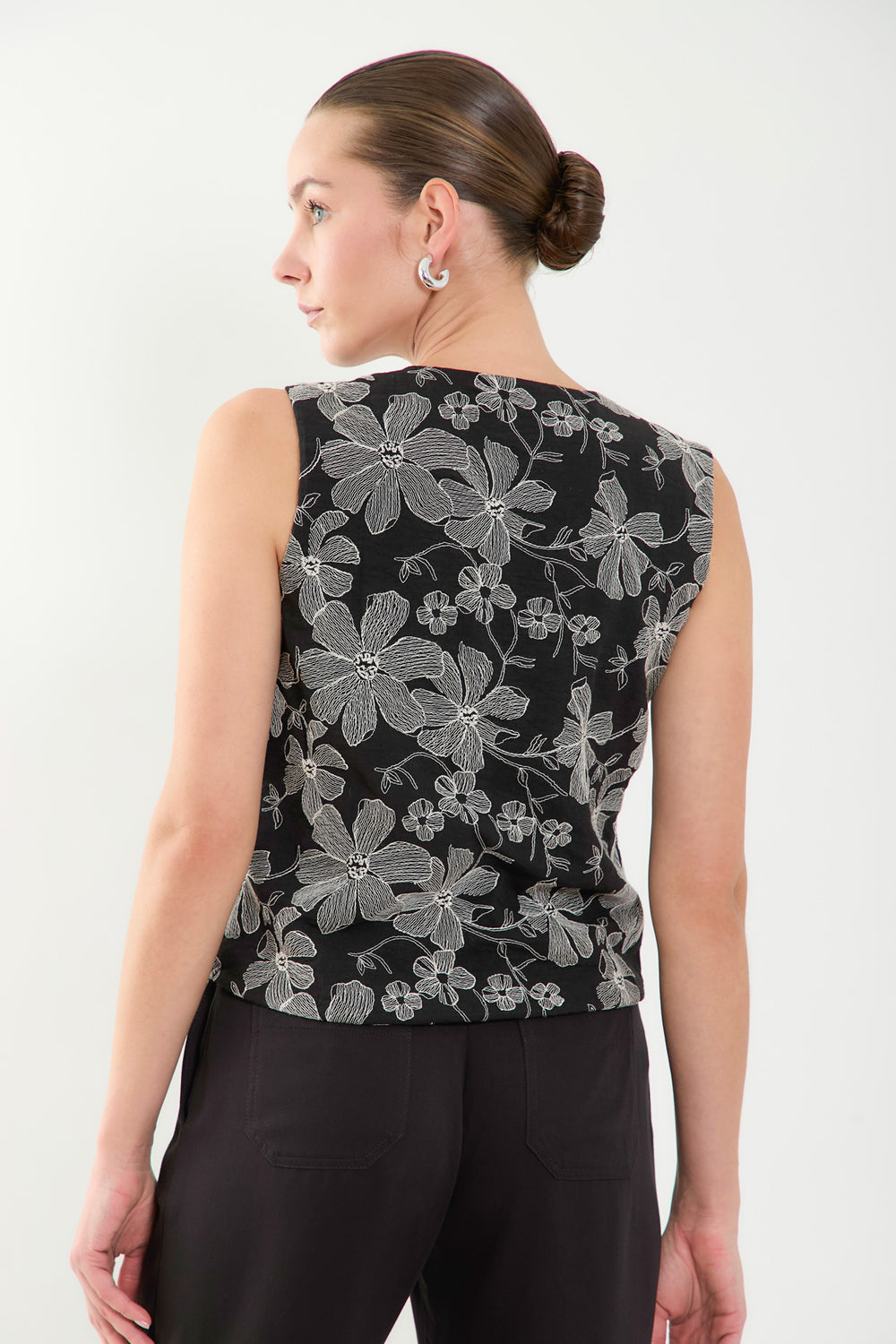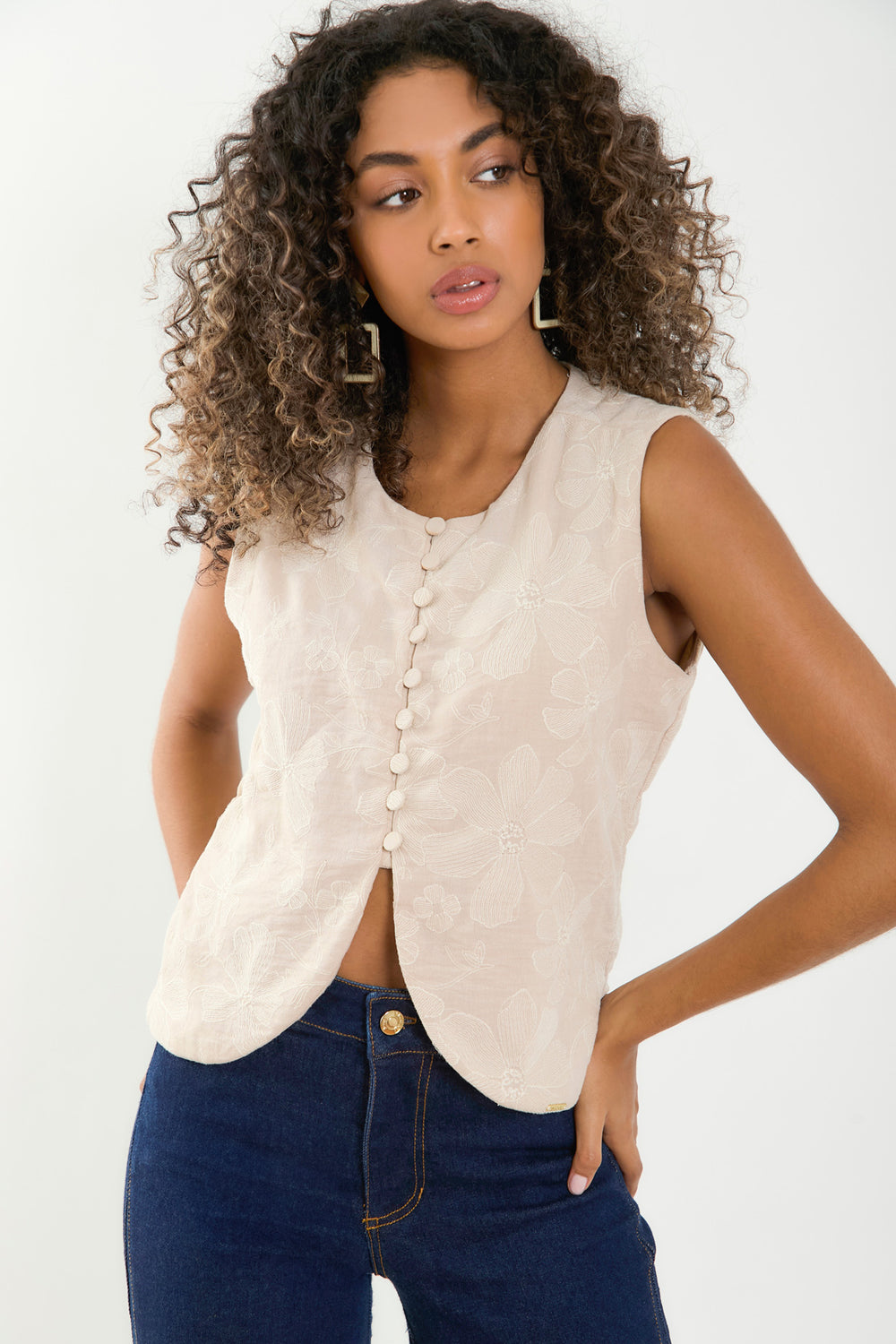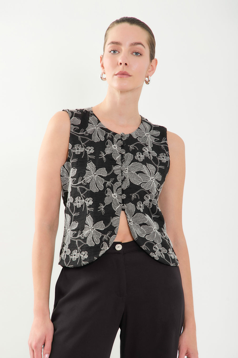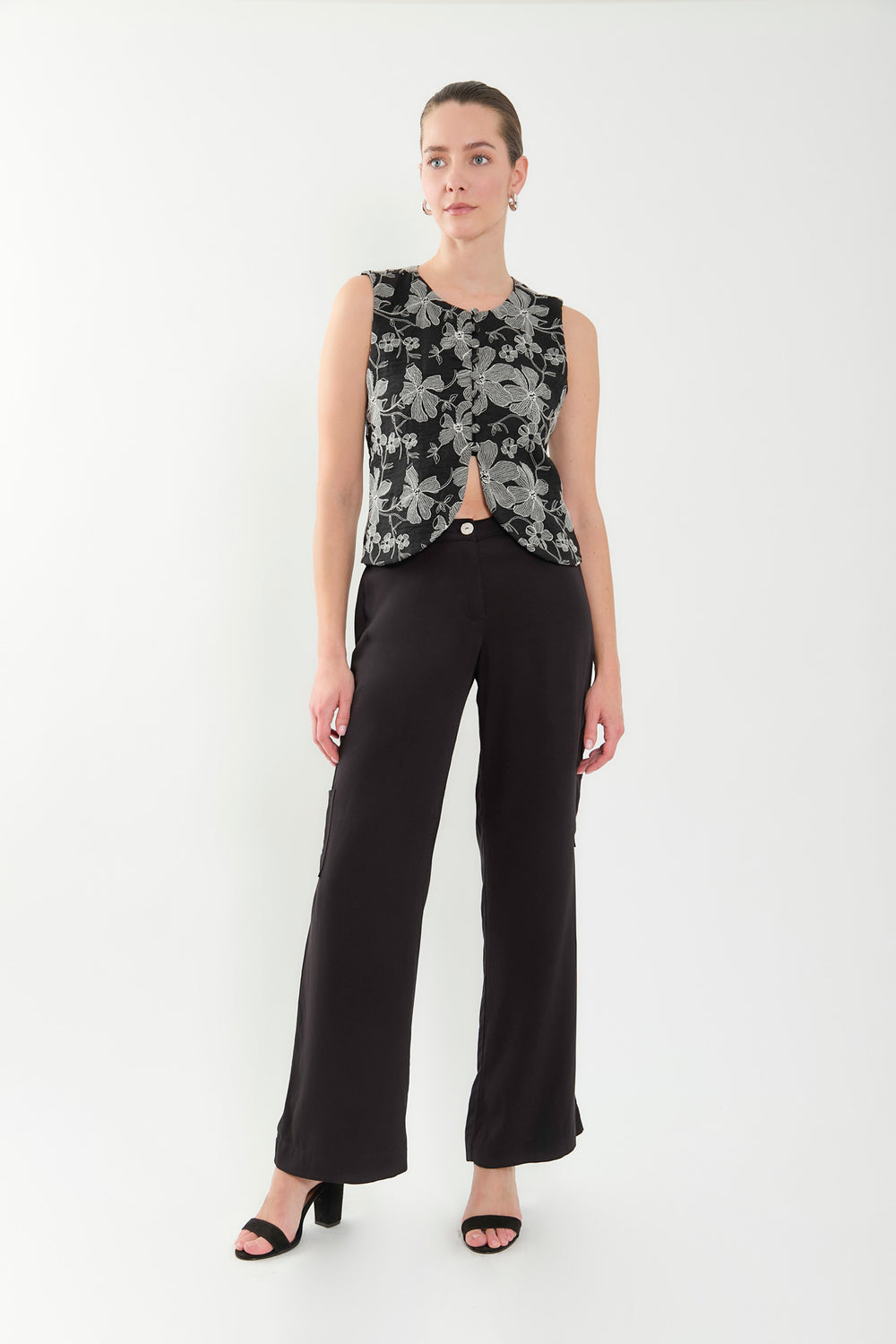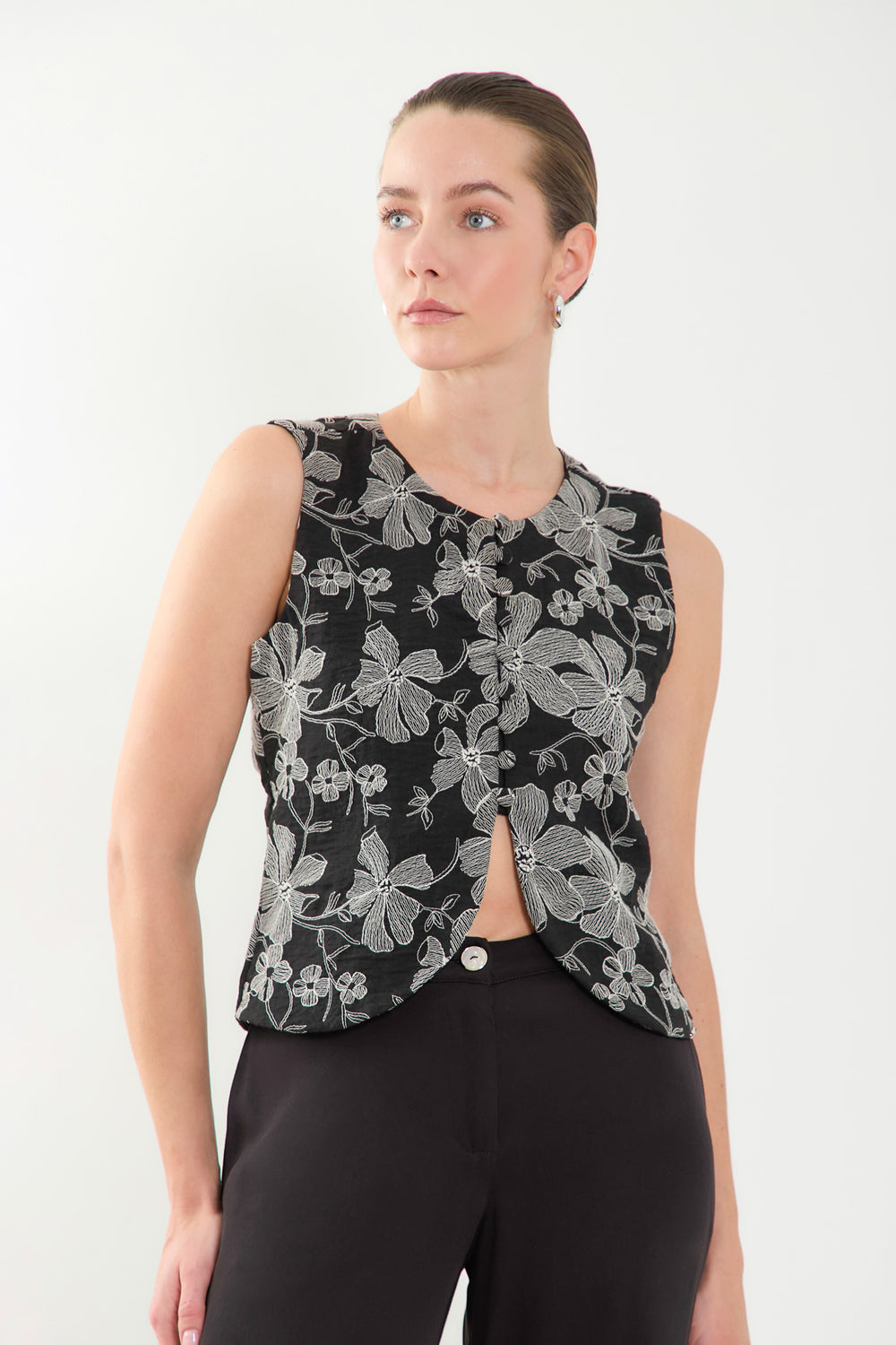Nuestro chaleco corto combina elegancia y estilo con un toque artesanal. Con un diseño bordado en tonos negro y beige, destaca por sus botones forrados que aportan un acabado sofisticado. Confeccionado en 100% poliéster, es una prenda ligera y versátil, perfecta para elevar cualquier look casual o formal