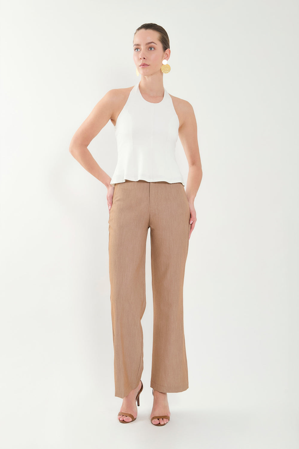 Nuestro pantalón es una prenda versátil y atemporal que combina elegancia con comodidad. Confeccionado en una tela suave de textura sutil, presenta un diseño de tiro alto que estiliza la figura y una silueta recta que aporta un look moderno y relajado.