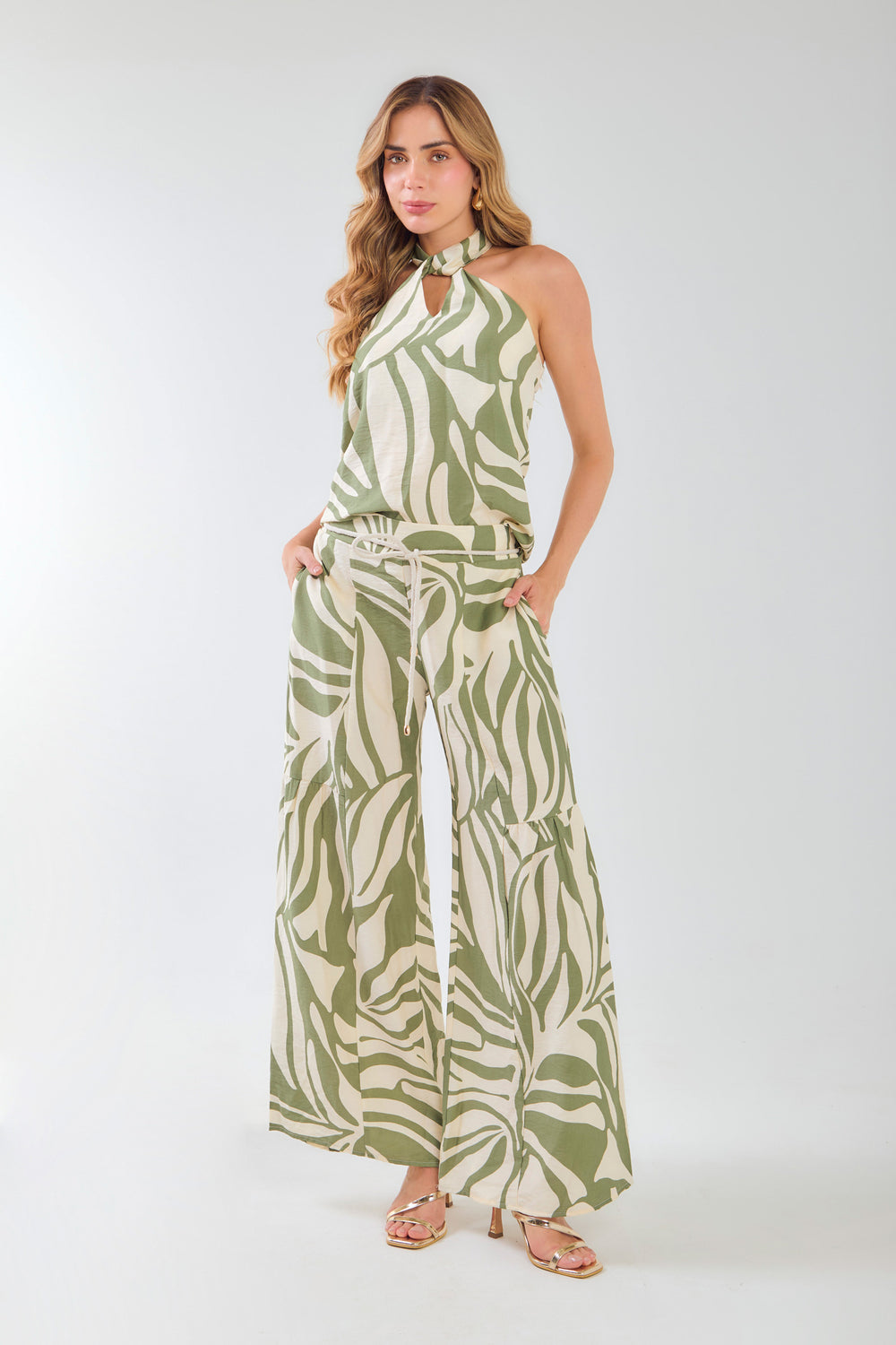 Pantalón tipo palazzo con estampado tropical. Tiro alto, pretina con botón decorativo y silueta amplia que estiliza la figura. Ideal para looks frescos y sofisticados.