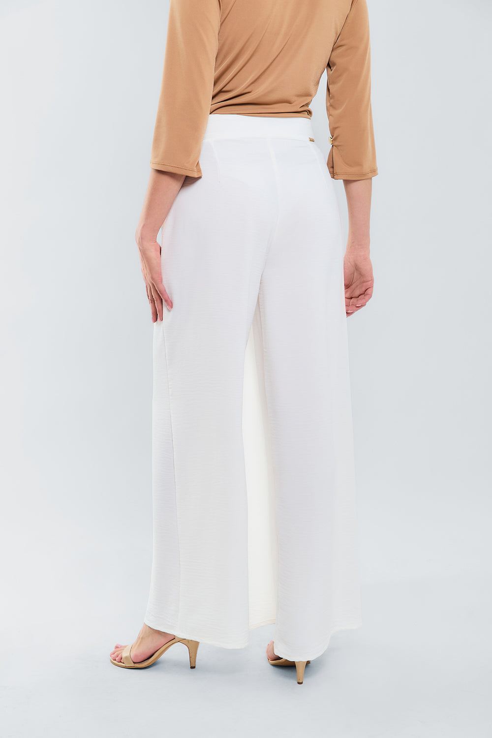 Pantalón de pierna ancha con elegante detalle dorado en la cintura, fluido y sofisticado, perfecto para un look moderno y distinguido.