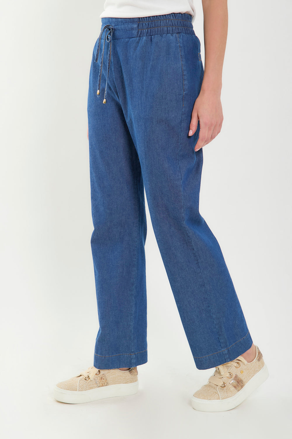 Este pantalón tipo jogger combina la comodidad del estilo deportivo con el look clásico del denim. Confeccionado en tela liviana tipo jean, cuenta con pretina elástica y cordón ajustable con terminaciones metálicas, lo que garantiza un calce cómodo y versátil. Su diseño de bota recta y bolsillos laterales lo hacen perfecto para looks relajados pero con estilo. Ideal para el día a día, combina fácilmente con camisetas básicas, blusas o buzos